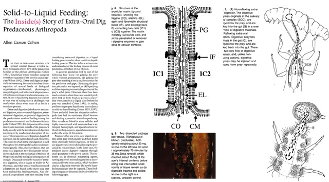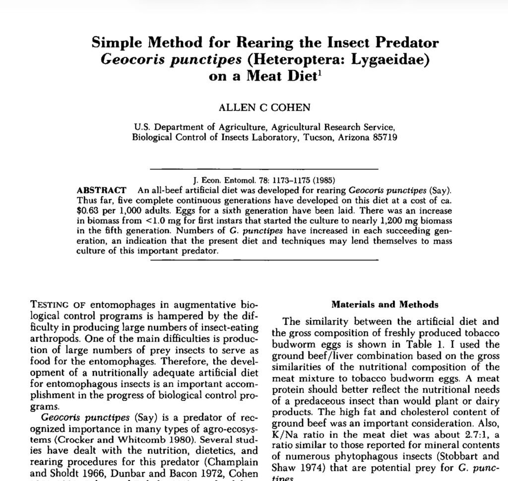 I will address the various outcomes of using EOD by many, many species of arthropods, but for now let me turn to the practical issue of diet development. If our target predators were ingesting hemolymph, they were getting more than 90-95 mg of water from each 100 mg of ingested hemolymph (leading to hypothesis 1: strictly liquid feeding). However, if the predators were ingesting all (most) of the insides of their prey, they would be consuming about 50 mg of water for every 100 mg of ingested material (slurry). This means that through EOD, they were about 10 X more efficient at extracting solid, high-nutrient food from their prey. Therefore, our second hypothesis was that through EOD, the predators were feeding selectively and more efficiently on high nutrient materials. The affirmation of this 2nd hypothesis led to the “if…then…” conclusion that if we offered the predators non-insect diet components such as meat products, their food would be much more like insect insides in their nutrient concentration, texture/consistency, and digestibility. The experiments with meat diets proved successful after we made adjustments for proportions of various nutrients and a suitable presentation system that would adequately mimic the natural prey, leading to the below publication: