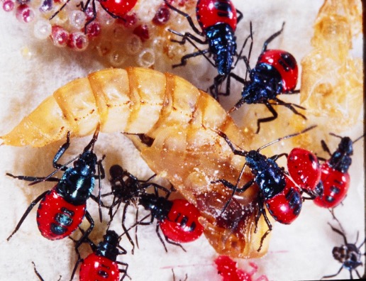 Figure 1 (Feb. 22, 2026 Blog). Euthyrhynchus floridanus (the Florida predatory stink bug) 2nd instar nymphs feeding on a Tenebrio molitor pupa. This colony came from the late Professor William S. Bowers from the University of Arizona. The large size and rather easy rearing of this predatory stink bug allowed us to use it as a model system to study extra-oral digestion (EOD) and other features of its hemipteran/heteropteran biology.