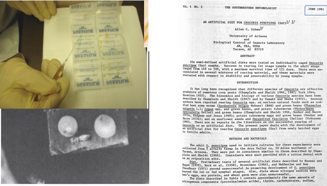 Figure 4 (Feb. 22, 2026 Blog) shows two Euthyrhynchus floridanus (predatory stink bugs, family Pentatomidae) feeding on the Cohen 1985 diet developed for G. punctipes (see Figure 3).