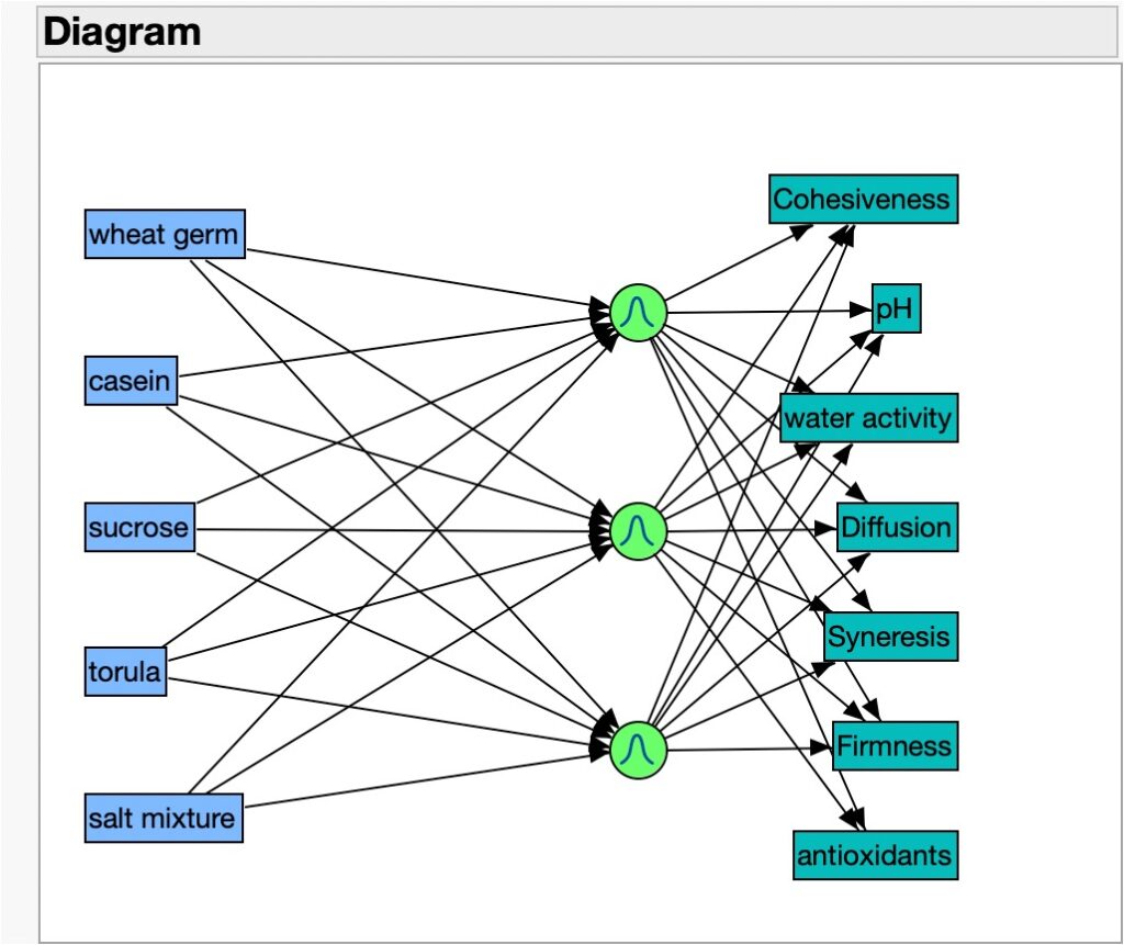 I then measured the 7 responses (cohesiveness, pH, water activity, diffusion rate, synergism, firmness, and antioxidant capacity) and obtained the values specified in each of the columns in Table 1. This data table reflects a huge amount of information and understanding that we can glean from this inquiry-based approach to understanding diets and other rearing systems components and interactions. I then used this table for a neural network analysis also supported by JMP. After selecting the 5 factors and the 7 responses in this dataset, I started a neural analysis with a Gaussian distribution goal and got the following diagram:
