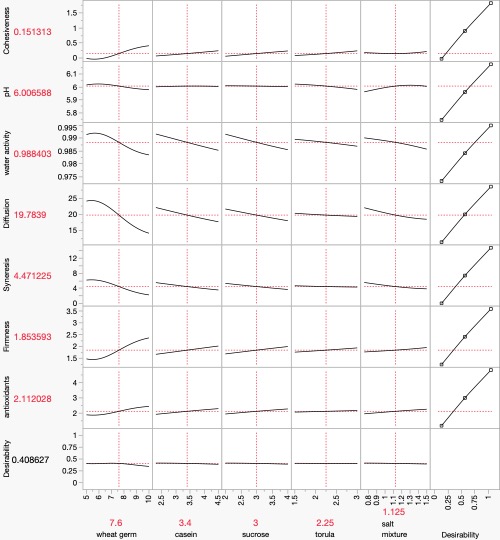 Figure 3. JMP Profile of Neural Analysis of Yamamoto Diet factors and responses. Please note from this figure that at a glance we can evaluate (and understand) how, for example, wheat germ in different concentrations affects cohesiveness, revealing that as wheat germ increases, cohesiveness increases. At the same time, as wheat germ increases, water activity and rate of diffusion both decrease while firmness is substantially increased. We can go through all the parameters (or factors) to see how they affect the physical-chemical responses of the diet. For now, suffice it to say that these tools, design of experiments and neural networking allows us to use data-based analysis of physical and biological responses to manipulation of various rearing factors.
