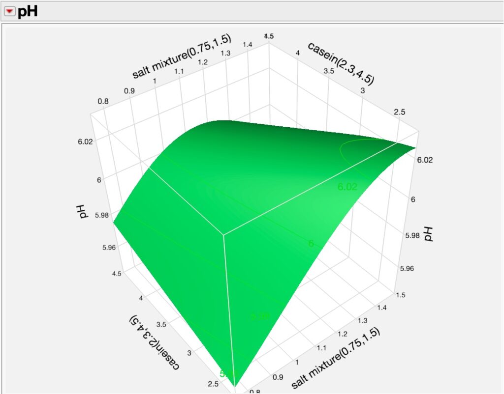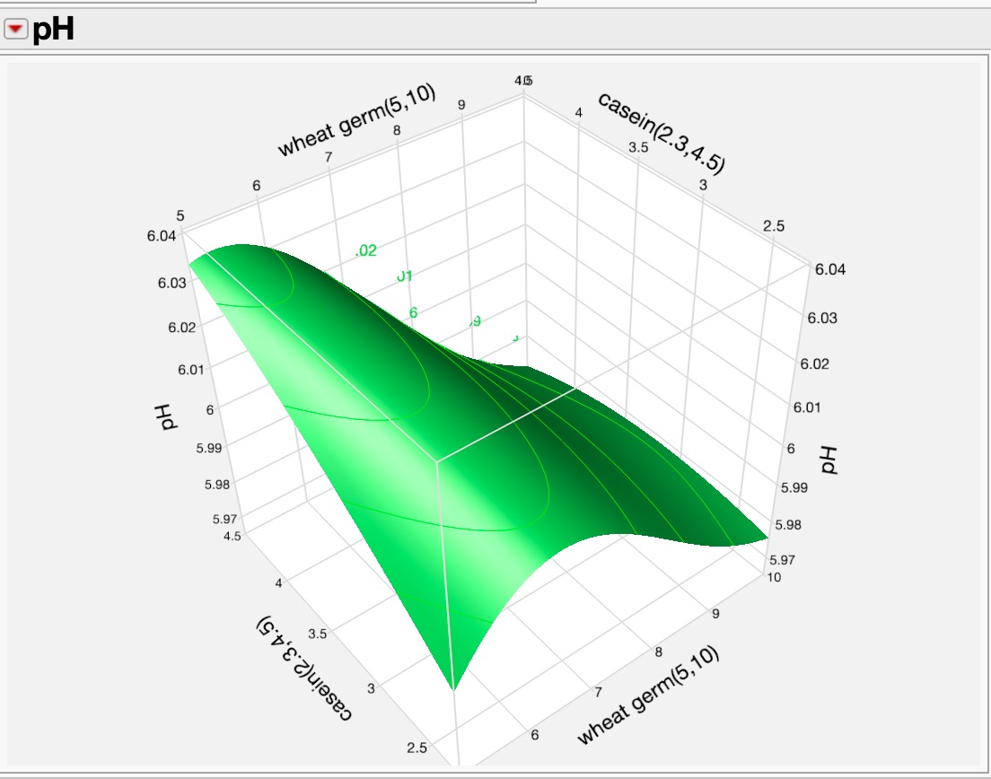Using DoE and Neural analyses, we can further explore relationships between the various factors in the experiments and their responses using 3D surface plotting as seen in two of many possible examples where we see the dynamics of wheat germ concentrations and casein as they affect diet pH and salt mixture and casein effects on pH.
