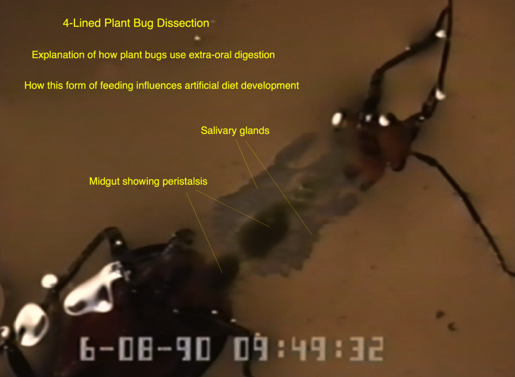 Figure 1. Graphic explanation of how a plant bug uses extra-oral digestion (EOD) to feed on plant leaf tissues. I use this case study as an example of how EOD used by many insects to pre-digest their meal before ingesting it can lead to development of an artificial diet. In this case study, I explain how Dr. Jack Debolt developed the first working diet (Debolt 1982) for the western tarnished plant bug, Lygus hesperus. But the rest of the story is how misunderstanding the true nature of plant bugs’ feeding biology led to decades of failure to develop artificial diets for members of this family. The 4-lined plant bug, Hemiptera: Miridae, does impressive damage to various plants due to its use of tissue-macerating enzymes from these huge salivary glands (Cohen, A.C. and A.G. Wheeler. 1998. Role of saliva in the highly destructive four-lined plant bug (Hemiptera: Miridae). Annals Ent. Soc. Amer. 91:94-100.). The Case Study here on development of artificial diets for plant bugs and other Hemiptera serves as a crucial and fascinating lesson in why it’s important to “KNOW YOUR INSECT.”